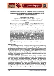 This research aims to determine the effectiveness of using Artificial Intelligence (AI) in learning Arabic in the era of Society 5.0. The approach used is a concept analysis approach with the Systematic Literature Review (SLR) method, which consists of 8 stages, namely identification of research questions, developing research protocols, establishing database locations, selection of relevant studies, selecting quality studies, extraction of data from individual studies, synthesis of results, and presentation of results. Meanwhile, this research shows that the application of Artificial Intelligence (AI) in learning Arabic in the era of Society 5.0 is efficient and helpful in supporting the learning process. Among them, it can help in correcting errors in Arabic texts, helps search for material, references, questions, journals/articles, and digital books, it increases students' learning motivation because it is exciting and fun, supports language practice and understanding, helps practice speaking, writing, and gets instant grammar explanations, corrects their mistakes quickly and effectively, translates Arabic texts, helps in data analysis and understanding the context of Arabic texts, improves good use of the language, supports conversation practice, provides feedback and reference sources and learning tools with features that enrich the process of learning Arabic.