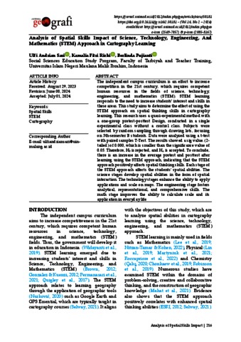 Sari, Ulfi Andrian, Rizki, Kamalia Fitri and Pujianti, Berlinda (2024) Analysis of spatial skills impact of Science, Technology, Engineering, And Mathematics (STEM) approach in cartography learning. Jurnal Geografi, 16 (2). pp. 216-226. ISSN 2549-7057