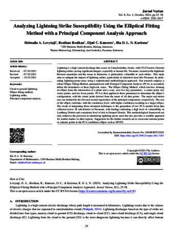 Lightning is a high-current discharge that occurs in Cumulonimbus clouds, with CG (Cloud to Ground) lightning strikes posing significant dangers, especially to human life. Pasuruan, located in the highlands between mountains and the ocean in Indonesia, is particularly vulnerable to such strikes. This study aims to mitigate the impact of lightning strikes, particularly in industrial areas like Pasuruan, by delin eating lightning-prone areas using a sophisticated methodological approach. Our research employs a robust Ellipse Fitting Method, parameterized with Principal Component Analysis (PCA), to accurately define the boundaries of these high-risk zones. The Ellipse Fitting Method, which involves forming an ellipse from the intersection of a plane and a cone, uses five key parameters: a center point, two vertex points, and two focus points. PCA is then applied to these parameters to determine the ellipse’s configuration, with the center point derived from the mean of all data points. The major and minor axes are defined by the first and second eigenvalues of the principal components, respectively. The size of the ellipse correlates with the confidence level, with higher confidence resulting in a larger ellipse. The result of integrating these advanced techniques is the generation of two PCA models from data collected across 28 sub-districts in Pasuruan, with findings indicating a high level of vulnerability in Lumbang District and a moderate level of risk in Gempol District. This methodological framework not only enhances the precision in identifying lightning-prone areas but also provides a scalable approach for similar studies in other regions. Suggestion for the further research are to overcome extreme points or extreme points in the PCA confidence ellipse such as MVEE.
