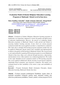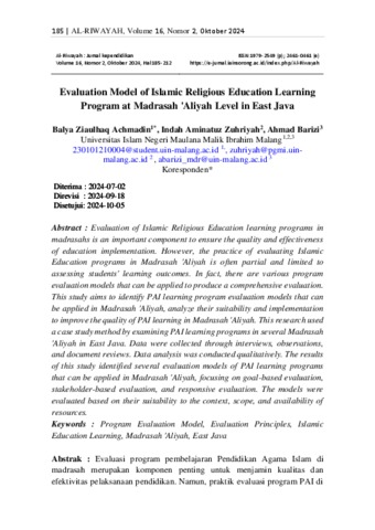 'Aliyah in East Java. Data were collected through interviews, observations, and document reviews. Data analysis was conducted qualitatively. The results of this study identified several evaluation models of PAI learning programsthat can be applied in Madrasah 'Aliyah, focusing on goal-based evaluation, stakeholder-based evaluation, and responsive evaluation. The models were evaluated based on their suitability to the context, scope, and availability of