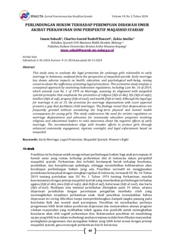 | Keywords: | Early Marriage; Legal Protection; Maqashid Syariah; Women’s Right |