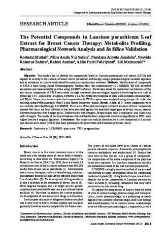 The potential compounds in lansium parasiticum leaf extract for breast cancer therapy: Metabolite profiling, pharmacological network analysis and in silico validation.