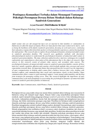 Pamukti, Aryani and Sa'diyah, Elok Halimatus (2024) Pentingnya komunikasi terbuka dalam menangani tantangan psikologis perempuan dewasa belum menikah dalam keluarga sandwich generations. Jurnal Representamen, 10 (1). pp. 1-13. ISSN 2443-3942