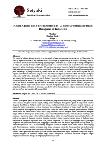 Konteks keberagaman agama di masyarakat merupakan isu yang semakin relevan dan penting dalam era globalisasi ini.Tema moderasi beragama menjadi sangat penting karena tantangan keberagaman agama di masyarakat semakin kompleks. Penelitian ini bertujuan untuk memberikan pemahaman terkait moderasi beragama menjadi landasan bagi masyarakat dalam menghadapi perbedaan keyakinan dan membangun kerukunan di tengah-tengah pluralitas agama. Metode penelitian ini menggunakan pendekatan literatur review dan analisis untuk mencapai tujuan tulisan ini. Melalui kedua sumber ini, penulis mencari artikel-artikel yang membahas moderasi beragama untuk kemudian dibandingkan dengan artikel ini. Dalam proses analisis kritis, penulis menemukan perbedaan dalam pendekatan, fokus, metodologi, atau penemuan yang dibahas dalam artikel-artikel terdahulu dengan artikel ini. Hasil penelitian ini menjelaskan bahwa, (1) moderasi beragama di Indonesia memiliki keunikan tersendiri, karena keanekaragaman agama di Indonesia yang mencerminkan keragaman keyakinan, nilai, dan praktik keagamaan.(2) Konflik atau ketegangan antara pandangan keagamaan dan penemuan ilmiah dapat mengganggu kedamaian sosial dan perkembangan ilmiah di masyarakat. (3) Pendekatan pemikiran Ian G. Barbour tentang dialog dan keselarasan menjadi relevan dalam konteks Indonesia yang unik. Kesimpulan dari penelitian ini adanya relasi antara pandangan agama dan ilmu pengetahuan dapat diselesaikan dengan cara yang harmonis dan membangun hubungan yang saling menghormati satu sama lain. Perspektif Ian G. Barbour, relasi agama dan sains dapat dijelaskan melalui empat pendekatan konflik, independen, dialog, dan integrasi. Moderasi beragama di Indonesia menjadi upaya untuk mewujudkan kerukunan antarumat beragama dengan mengedepankan toleransi, dialog, dan menghargai perbedaan keyakinan.