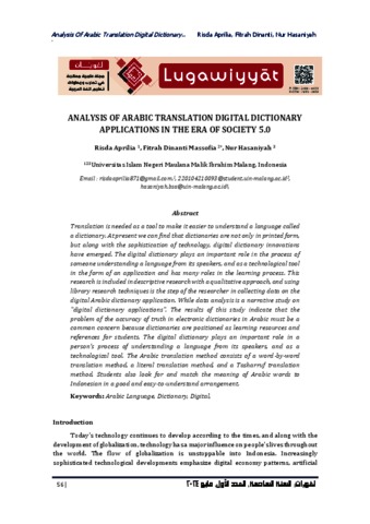 Aprilia, Risda, Massofia, Fitrah Dinanti and Hasaniyah, Nur (2024) Analysis of Arabic translation digital dictionary applications in the era of society 5.0. Lugawiyyat, 6 (1). ISSN 2686-6420