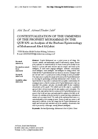 Prophet Muhammad was a perfect person in all things. His character, attitude, and intellectuality cannot be determined by anyone. Because of his profession, he received the title of Al-Amin, because of his morality he was known as a person with noble character and an example, and because of his intelligence, he could master language intelligence, arithmetic, memorization, visual intelligence, vision intelligence, and intelligence in solving problems. But behind all that, Prophet Muhammad was known as an ummi, meaning he could not read and write. Is a perfect person worthy of having an ummi personality? This study aims to explain the concept of the ummi of the Prophet Muhammad by observing the epistemology of Burhani Muhammad Abed Al-Jabiri. It is hoped that later it can produce a conclusion that successfully recontextualizes the meaning of ummi so that the existence of the Prophet Muhammad is truly very important. His greatness and glory can factually fulfill the four mandatory characteristics of the apostle. The method used in this study is a qualitative approach that is library-based and the data analysis used is descriptive. The results of this study indicate that the existence of the Prophet Muhammad as an ummi is that he did not know and understand the contents of the Bible at all. However, the revelation of the Qur'an that he received had many similarities in content, such as previous stories. The results of this conclusion then became a re-contextualization of the meaning of ummi, because if until now ummi is still interpreted as illiterate, it does not change that the Prophet Muhammad was stupid and backward and contradicts one of the mandatory characteristics that must be possessed by a Messenger, namely fathanah (intelligent).