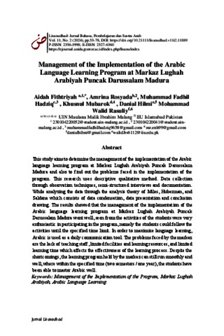 Idāratu Tanfīżi Barnāmaji Ta’līmi al-Lughah al-`Arabiyyah fi Markazi al-Lughah al-`Arabiyyah bi Puncak Darussalam Madura.