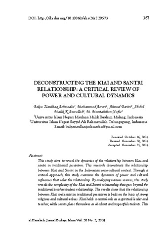 This study aims to reveal the dynamics of the relationship between Kiai and santri in traditional pesantren. This research deconstructs the relationship between Kiai and Santri in the Indonesian socio-cultural context. Through a critical approach, this study examines the dynamics of power and cultural influences that color the relationship. By analyzing various sources, this study reveals the complexity of the Kiai and Santri relationship that goes beyond the traditional teacher-student relationship. The results show that the relationship between Kiai and santri in traditional pesantren is built on the basis of strong religious and cultural values. Kiai holds a central role as a spiritual leader and teacher, while santri place themselves as obedient and respectful students. This relationship is characterized by a clear hierarchy, where Kiai has great authority and influence over santri. However, the dynamics of this relationship do not always run smoothly. There are potential conflicts that arise due to differences in interpretation of religious values, differences in socio-economic backgrounds, and the influence of changing times. Kiai are required to be able to maintain a balance between maintaining traditional values and adjusting to the demands of the times and their relevance to social and political changes affecting the relationship between Kiai and Santri