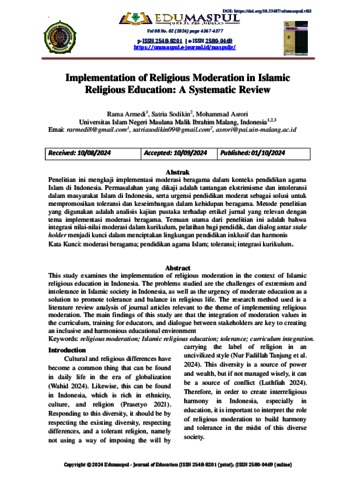 Penelitian ini mengkaji implementasi moderasi beragama dalam konteks pendidikan agama Islam di Indonesia. Permasalahan yang dikaji adalah tantangan ekstrimisme dan intoleransi dalam masyarakat Islam di Indonesia, serta urgensi pendidikan moderat sebagai solusi untuk mempromosikan toleransi dan keseimbangan dalam kehidupan beragama. Metode penelitian yang digunakan adalah analisis kajian pustaka terhadap ertikel jurnal yang relevan dengan tema implementasi moderasi beragama. Temuan utama dari penelitian ini adalah bahwa integrasi nilai-nilai moderasi dalam kurikulum, pelatihan bagi pendidik, dan dialog antar stake holder menjadi kunci dalam menciptakan lingkungan pendidikan inklusif dan harmonis