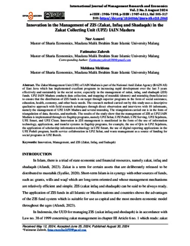 The Zakat Management Unit (UPZ) of IAIN Madura is part of the National Amil Zakat Agency (BAZNAS) of East Java which has implemented excellent programs in increasing rapid development over the last 5 years effectively and sustainably in the social sector, especially in the management of zakat, infaq, and shadaqah (ZIS) funds. UPZ IAIN Madura conducts data collection, and mapping of muzakki (donors) and mustahiq (beneficiaries) to ensure that the distribution of ZIS funds is on target through superior programs in the form of social assistance, education, health, economy, and other basic needs. The research method carried out by this study uses a descriptive qualitative approach with field research techniques through direct observation and interviews with 10 informants, namely the management of UPZ IAIN Madura and several mustahiq. The triangulation carried out is in the form of triangulation of data, theories, and methods. The results of the study show that the management of ZIS at UPZ IAIN Madura is implemented through six flagship programs, namely UPZ Sehat, UPZ Peduli, UPZ Serving, UPZ Sejahtera, UPZ Smart, and UPZ Clean. Innovation in ZIS management is manifested in the form of the use of information technology, applications, and transfer systems in flagship programs, for example, the use of Qris in UPZ Sejahtera, the application of scholarship information technology in UPZ Smart, the use of digital reporting applications in the UPZ Peduli program, health service collaboration in UPZ Sehat, and waste management as a source of funding for social programs in UPZ Bersih.