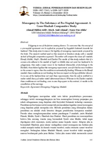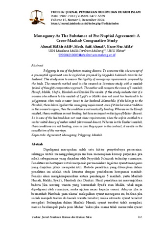 تعدّ تعدد الزوجات من العوامل المسببة للطلاق. وللتغلب على ذلك، يمكن تطبيق مفهوم عقد ما قبل الزواج كما اقترحته السيدة سكينة على زوجها. تهدف هذه الدراسة إلى الإجابة على شرعية شروط الأحادية الزوجية التي اقترحتها الزوجة. منهج البحث المستخدم في هذه الدراسة هو دراسة الأدب مع منهج مقارن بين المذاهب. سيقوم الباحث بمقارنة آراء خمسة مذاهب؛ الحنفي، المالكي، الشافعي، الحنبلي، والظاهرية. تشير نتائج هذه الدراسة إلى أنه إذا كانت المرأة التي تتبع مذهب الشافعي أو المالكي لا ترغب في أن يكون زوجها متعدداً للزوجات، فيجب عليها أن تنذر زوجها. بينما إذا كانت تنتمي إلى مذهب الحنبلي، فإن العلماء يشرّعون هذا الشرط الأحادي الزوجية، حتى وإن أصبح هذا التقليد في منطقة المرأة، فإن الشرط يصبح ملزماً تلقائياً. أما في مذهب الحنفي، فإن هذه الشروط غير ملزمة، ولكنها تؤثر على نوع المهر. لذا في حال عدم الوفاء بهذه الشروط من قبل الزوج، يحق للزوجة الحصول على مهر مثل. أما في مذهب الظاهرية، فإن هذه الشروط غير ملزمة، بل إذا ظهرت في العقد، فإنها تؤدي إلى إلغاء الزواج.