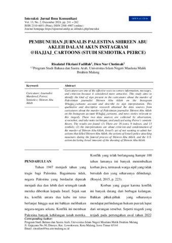 Fadillah, Risalatul Fikriani and Chotimah, Dien Nur (2024) Pembunuhan jurnalis Palestina Shireen Abu Akleh dalam akun Instagram @Hajjaj_Cartoons: Studi semiotika Peirce. Interaksi: Jurnal Ilmu Komunikasi, 13 (2). pp. 241-262. ISSN 25484907