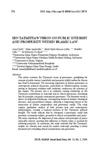 This article examines Ibn Taymiyya's vision of governance, spotlighting the concepts of public interest (mas{lahah) and prosperity (falâh) within the Islamic law (sharî’a) framework. The increasing importance of Islamic governance in contemporary political discussions, particularly in Muslim-majority societies striving to harmonize tradition with modernity, underscores the relevance of this inquiry. The primary aim is to synthesize existing scholarship on Ibn Taymiyya's contributions to statecraft and its ethical dimensions, elucidating how his principles can guide contemporary governance. The literature reveals a diverse yet fragmented landscape, encompassing historical analysis, theological discourse, and socio-political critiques, reflecting a burgeoning interest in the intersection of Islamic jurisprudence and governance models. This study employs qualitative analysis of both primary texts and contemporary interpretations, creating a nuanced overview of Ibn Taymiyya's political thought. The results indicate that he champions a governance model that prioritizes community welfare, grounded in ethical accountability and justice. His vision emphasizes the alignment of state policies with principles of justice and public interest, asserting that adherence to Islamic values is essential for achieving prosperity. In conclusion, this study contends that Ibn Taymiyya’s insights are relevant and crucial for modern statecraft, providing a robust framework for embedding ethical considerations into governance.