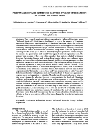 This research explores indirect expression in Mahmoud Darwish's poem "Bithoqoh Huwiyyah" (With Identity Confidence) to convey the message of Palestinian resistance. The poem, a significant piece of Palestinian literature, reflects the resilience of the Palestinian people in the face of ongoing oppression and struggles for identity and autonomy. Through figurative language, Darwish communicates complex political and social themes related to Palestinian resistance, using subtle forms of expression to convey powerful messages of defiance. The study employs qualitative content analysis to examine the poem's text and identify the types of indirect expression used. The primary data consists of the poem, while secondary data includes scholarly articles on Darwish, Palestinian history, and socio-political context. Data were collected using reading and note-taking techniques, and the analysis follows a three-stage process: data reduction, presentation, and conclusion drawing. The findings reveal four distinct types of indirect expression in the poem: talwih, ta'ridh, ramz, and ima'/isyarah. These expressions convey themes of resistance through various forms, such as existential declarations, social criticism, and subtle threats. For instance, Darwish uses indirect expressions like "Take note, I am an Arab" and "I am a name without a title" to assert Palestinian identity, while phrases such as "I eat the flesh of those who oppress me" express anger and opposition to injustice. These forms of figurative language enhance the poem's impact by allowing Darwish to communicate the depth of Palestinian suffering and the enduring spirit of resistance without resorting to confrontation. The study highlights how Darwish's indirect expression transforms his poetry into a tool for cultural resilience, offering both a voice for the oppressed and a means of resistance. The research contributes to the broader understanding of literature as a powerful form of political resistance, demonstrating how poetry can subtly yet profoundly influence collective identity and social movements. By analyzing the indirect expressions in Darwish's work, this study underscores the importance of art in political discourse, offering a deeper appreciation of how literature shapes the struggle for justice and freedom.