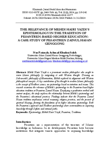 philosophical concepts. A key contribution of his thought to modern Islamic philosophy is the concept of Hudhuri science, an epistemology based on intuition and reason. This research examines the relevance of Mehdi’s epistemology to the Pesantren-based higher education tradition at Pesantren Zainul Hasan. Employing a qualitative method with
