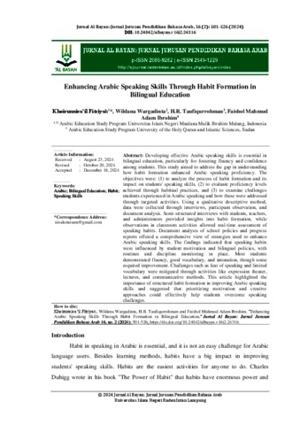 Developing effective Arabic speaking skills is essential in bilingual education, particularly for fostering fluency and confidence among students. This study aimed to address the gap in understanding how habit formation enhanced Arabic speaking proficiency. The objectives were: (1) to analyze the process of habit formation and its impact on students' speaking skills, (2) to evaluate proficiency levels achieved through habitual practices, and (3) to examine challenges students experienced in Arabic speaking and how these were addressed through targeted activities. Using a qualitative descriptive method, data were collected through interviews, participant observation, and document analysis. Semi-structured interviews with students, teachers, and administrators provided insights into habit formation, while observations in classroom activities allowed real-time assessment of speaking habits. Document analysis of school policies and progress reports offered a comprehensive view of strategies used to enhance Arabic speaking skills. The findings indicated that speaking habits were influenced by student motivation and bilingual policies, with routines and discipline monitoring in place. Most students demonstrated fluency, good vocabulary, and intonation, though some required improvement. Challenges such as fear of speaking and limited vocabulary were mitigated through activities like expression theater, lectures, and communicative methods. This article highlighted the importance of structured habit formation in improving Arabic speaking skills and suggested that prioritizing motivation and creative approaches could effectively help students overcome speaking challenges.