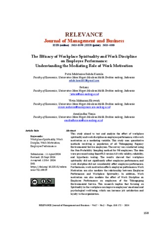 The efficacy of workplace spirituality and work discipline on employee performance: Understanding the mediating role of work motivation.