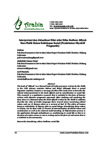 Mustofa, Arif, Gufron, Gufron and Rauf, Abdullah Zainur (2020) Interpretasi dan aktualisasi nilai-nilai etika Nadham Alfiyah Ibnu Malik dalam kehidupan sosial (pendekatan obyektif pragmatik). Arabia: Jurnal Pendidikan Bahasa Arab, 12 (1). pp. 54-73. ISSN 2085-644x