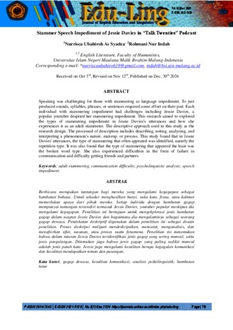 Speaking was challenging for those with stammering as language impediment. To just produced sounds, syllables, phrases, or sentences required some effort on their part. Each individual with stammering impediment had challenges including Jessie Davies, a popular youtuber despited her stammering impediment. This research aimed to explored the types of stammering impediment in Jessie Davies's utterances and how she experiences it as an adult stammerer. The descriptive approach used in this study as the research design. The processed of description includes describing, noting, analyzing, and interpreting a phenomenon's nature, makeup, or process. This study found that in Jessie Davies' utterances, the type of stammering that often appeared was identified, namely the repetition type. It was also found that the type of stammering that appeared the least was the broken word type. She also experienced difficulties in the form of failure in communication and difficulty getting friends and partners.