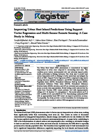 The Urban Heat Island (UHI) phenomenon causes significant temperature increases in urban areas, adversely affecting the environment and public health. This research develops a prediction model of land surface temperature in Malang City using Support Vector Regression (SVR) with remote sensing data from Landsat-8, Sentinel-2, and SRTM. A cloud masking process is applied to improve image quality, while features such as NDVI, NDBI, NDWI, NDMI, elevation, and LST are calculated and normalized. The test results show that the Radial Basis Function (RBF) kernel with hyperparameters C = 10, Epsilon = 0.1, and gamma = 1 provides the best performance, with R² of 0.887, MSE of 1.625, and MAPE of 2.71%. This study shows that SVR with RBF kernel and appropriate tuning parameters can improve prediction accuracy. These results provide a strong basis for the development of more effective prediction models in managing UHI in big cities.