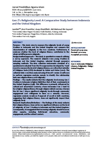 Research implications/limitations–The findings of the study indicate that religious literacy does not have a significant influence on the level of religiosity of Gen Z Muslims in Indonesia and the United Kingdom. Consequently, it is suggested that increasing religiosity should focus on other aspects, including faith-based education, community engagement, and the cultural context.