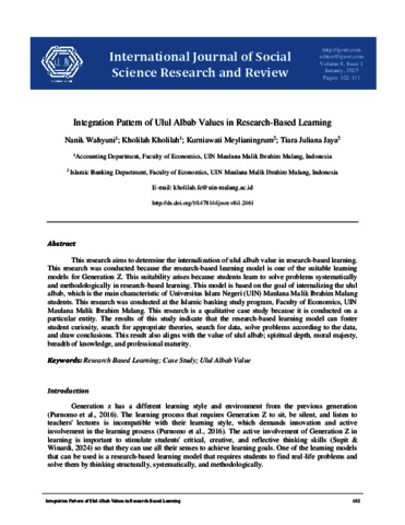 This research aims to determine the internalization of ulul albab value in research-based learning. This research was conducted because the research-based learning model is one of the suitable learning models for Generation Z. This suitability arises because students learn to solve problems systematically and methodologically in research-based learning. This model is based on the goal of internalizing the ulul albab, which is the main characteristic of Universitas Islam Negeri (UIN) Maulana Malik Ibrahim Malang students. This research was conducted at the Islamic banking study program, Faculty of Economics, UIN Maulana Malik Ibrahim Malang. This research is a qualitative case study because it is conducted on a particular entity. The results of this study indicate that the research-based learning model can foster student curiosity, search for appropriate theories, search for data, solve problems according to the data, and draw conclusions. This result also aligns with the value of ulul albab; spiritual depth, moral majesty, breadth of knowledge, and professional maturity.