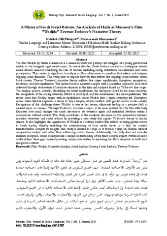 The film Wadjda by Haifaa al-Mansour is a cinematic work that portrays the struggles of a young girl in Saudi Arabia as she navigates rigid social norms. In recent decades, Saudi Arabian society has undergone various social reforms aimed at redefining the role of women, including easing restrictions on education and social participation. This context is significant to analyze, as films often serve as a medium that reflects and critiques ongoing social dynamics. This study aims to explore how the film reflects the ongoing social reforms within Saudi society. Tzvetan Todorov's narrative theory outlines five stages: equilibrium, disruption, recognition, resolution, and new equilibrium. The method used is narrative analysis with a qualitative approach. Data were collected through observation of narrative elements in the film and analyzed based on Todorov's five stages. The analysis process includes identifying the initial equilibrium, the disruption faced by the main character, the recognition of the arising situation, efforts to remedy it, and the achievement of a new equilibrium. The results show that Wadjda begins with an equilibrium, where Wadjda lives a typical everyday life. Disruption occurs when Wadjda expresses a desire to buy a bicycle, which conflicts with gender norms in her society. Recognition of this challenge drives Wadjda to pursue her dream, ultimately leading to a positive shift in societal views on women. Through Todorov's narrative analysis, it becomes evident that the film effectively illustrates how small changes can spark discussions on women's rights and individual freedom within a conservative cultural context. This study contributes to the academic discourse on the intersection between narrative structures and social reform by providing a case study that applies Todorov's theory to Arabic cinema. It also highlights the significance of Wadjda as a cultural artifact that reflects evolving gender norms in Saudi Arabia, thereby enriching the understanding of how media serves as a lens for societal transformation. Despite its insights, this study is limited in scope as it focuses solely on Wadjda without comparative analysis with other films addressing similar themes. Additionally, the study does not consider audience reception, which could provide a deeper understanding of the film's societal impact. Future research could address these gaps by incorporating comparative studies or exploring the film's reception in both local and global contexts.