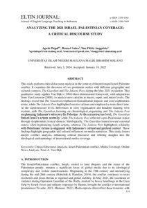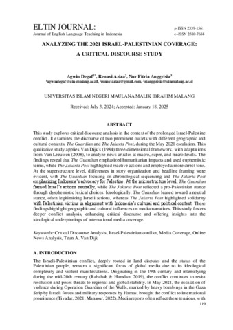 This study explores critical discourse analysis in the context of the prolonged Israel-Palestine conflict. It examines the discourse of two prominent outlets with different geographic and cultural contexts, The Guardian and The Jakarta Post, during the May 2021 escalation. This qualitative study applies Van Dijk's (1984) three-dimensional framework, with adaptations from Van Leeuwen (2008), to analyze news articles at macro, super, and micro levels. The findings reveal that The Guardian emphasized humanitarian impacts and used euphemistic terms, while The Jakarta Post highlighted reactive actions and employed a more direct tone. At the superstructure level, differences in story organization and headline framing were evident, with The Guardian focusing on chronological sequencing and The Jakarta Post emphasizing Indonesia’s advocacy for Palestine. At the microstructure level, The Guardian framed Israel’s actions neutrally, while The Jakarta Post reflected a pro-Palestinian stance through dysphemistic lexical choices. Ideologically, The Guardian leaned toward a neutral stance, often legitimizing Israeli actions, whereas The Jakarta Post highlighted solidarity with Palestinian victims in alignment with Indonesia’s cultural and political context. These findings highlight geographic and cultural influences on media narratives. This study fosters deeper conflict analysis, enhancing critical discourse and offering insights into the ideological underpinnings of international media coverage.