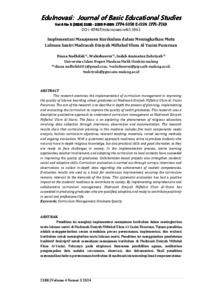 This research examines the implementation of curriculum management in improving the quality of Islamic boarding school graduates at Madrasah Diniyah Miftahul Ulum Al-Yasini Pasuruan. The aim of the research is to describe in depth the process of planning, implementing and evaluating the curriculum to improve the quality of santri graduates. This research uses a descriptive qualitative approach to understand curriculum management at Madrasah Diniyah Miftahul Ulum Al-Yasini. The focus is on exploring the phenomenon of religious education, involving data collection through interviews, observation and documentation. The research results show that curriculum planning in this madrasa includes five main components: needs analysis, holistic curriculum objectives, relevant teaching materials, varied learning methods, and ongoing evaluation. With a systematic approach, madrasas strive to produce students who not only have in-depth religious knowledge, but also practical skills and good character, so they are ready to face challenges in society. In the implementation process, active learning approaches, teacher involvement, and adapting the curriculum to local contexts have succeeded in improving the quality of graduates. Collaboration-based projects also strengthen students' social and adaptive skills. Curriculum evaluation is carried out through surveys, interviews and observations to collect in-depth data regarding the achievement of student competencies. Evaluation results are used as a basis for continuous improvement, ensuring the curriculum remains relevant to the demands of the times. This systematic evaluation has had a positive impact on the students' readiness to contribute to society. By implementing comprehensive and collaborative curriculum management, Madrasah Diniyah Miftahul Ulum Al-Yasini has succeeded in producing graduates who are qualified, adaptive, and ready to contribute positively in social and professional life.