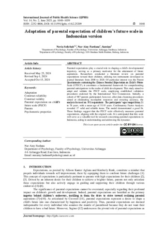 Parental expectations play a crucial role in shaping a child's developmental trajectory, serving as a primary motivator for the attainment of future aspirations. Researchers conducted a literature review on parental expectations toward their children, utilizing ten instruments developed in journal literature from 2008 to 2020. Of particular interest was the Parent Questionnaire containing the Chinese Parental Expectation on Child’s Future Scale (CPECF), it constitutes a fundamental framework for comprehending parental anticipations in the realm of child development. This study aimed to adapt and validate the PECF scale, employing established validation procedures endorsed by the International Test Commission. Initially, a cohort of 987 parents participated; however, after data cleansing procedures aimed at eliminating incomplete responses and ensuring accuracy, the analysis focused on 593 respondents. The participants’ ages ranged from 21 to 78 years, with a mean age of 35.93 years. Confirmatory Factor Analysis revealed 17 valid and reliable items. The model demonstrated a good fit. These findings suggest that the PECF scale effectively measures parental expectations, aligning with the original scale. It is anticipated that this scale will serve as a valuable tool for research concerning parental expectations in Indonesia, aiding in understanding and addressing the dynamics.