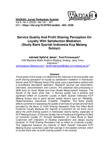 Janan, Akhmad Syifa'ul and Firmansyah, Fani (2025) Service quality and profit sharing perception on loyalty with satisfaction mediation: Study Bank Syariah Indonesia Kcp Malang Sutoyo. Wadiah: Jurnal Perbankan Syariah, 9 (2). pp. 161-187. ISSN 2599-1515