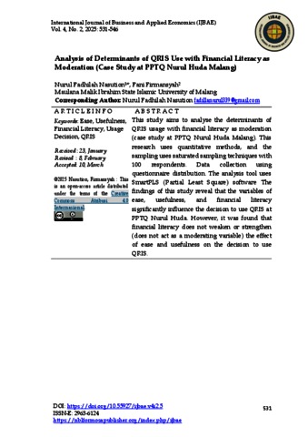 Nasution, Nurul Fadhilah and Firmansyah, Fani (2025) Analysis of determinants of QRIS use with financial literacy as moderation: Case study at PPTQ Nurul Huda Malang. International Journal of Business and Applied Economics (IJBAE), 4 (2). pp. 531-546. ISSN 2963-6124