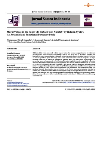 Moral values in the fable "An-Nahlah wan-Namlah" by Ridwan Syukri: An actantial and functional structure study.