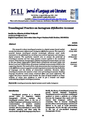 This research is about translingual practice in a digital context (social media), namely the Indonesian infotainment’s Instagram @folkative account. This research is essential because translingual practice increasingly influences social media interaction in this globalized era, enriching cross-cultural expression and creating a digital presence. This qualitative research aims to analyze the pattern(s) of translingual practice and how these patterns are/are applied in the mentioned account. Three theories, Canagarajah’s (2013a) translingual practice theory are used as the core theory, Zappavigna’s (2021) theory of discourse and social media, and Barton’s and Lee’s (2013) theory of computer-mediated communication (CMC) as the supporting theories. The results of this study demonstrate that translingual practice in the @folkative account suggests a complex negotiation process showing the fluidity of languages and the fluidity of interactional modalities. Moreover, digital translingual practice also contains a basic norm of translingual practice: breaking language boundaries, social justice, emotional effect, and social subjectivity. We suggest that future research could broaden the scope of digital platforms to blogs, websites, or online news platforms in order to get a broader and deeper understanding of digital translingual practices.