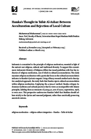 Indonesia upholds the principle of religious moderation to navigate its vast religious, cultural, and traditional diversity. To institutionalize this commitment, the Ministry of Religious Affairs has identified four key indicators of religious moderation, among which cultural accommodation remains an understudied aspect within Islamic Studies, particularly in Qur’anic exegesis. This study explores religious moderation with a specific focus on cultural accommodation as interpreted by Hamka in Tafsir Al-Azhar. Employing a library research method and a descriptive-analytical approach, this paper demonstrates that Hamka unequivocally rejects any form of religious moderation that involves accommodating local cultural practices. Through the al-Ijtimāʿī method, he consistently opposes Indonesian traditions and customs that he deems incompatible with Islamic teachings, classifying them as remnants of Jāhiliyyah, bid‘ah, superstition, myth, or even shirk. This study advances existing scholarship by offering a nuanced analysis of Hamka’s exegesis within the framework of religious moderation, particularly concerning cultural accommodation—an area that has received little scholarly attention. While most studies on Hamka emphasize his role as a modernist and reformist thinker, as well as his views on interreligious tolerance, this paper uniquely situates his thought within contemporary debates on religious pluralism and cultural adaptation. By critically examining Hamka’s rejection of local traditions, this study challenges prevailing narratives that depict him as a proponent of religious moderation in the context of cultural acculturation, offering a more refined and contextually grounded understanding of his interpretative approach.