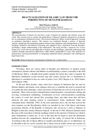 Prasetyo, Bakti and Fadil, Fadil (2025) Reactualization of Islamic law from the perspective of Munawir Sjadzali. Injurity: Interdiciplinary Journal and Humanity, 4 (1). pp. 77-85. ISSN 2963-4113