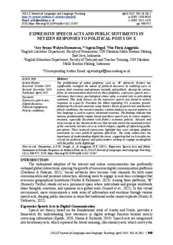 The rise of online platforms like "X" (formerly Twitter) has transformed political discourse, where netizens frequently use expressive speech acts to communicate emotions and opinions. This study examines how expressive speech acts are used in netizen comments responding to President Joe Biden's post about U.S. economic growth, focusing on emotional expressions that reflect public sentiment. Through the application of Searle's theory of speech acts and Austin's felicity conditions, the research analyzes 46 comments using content analysis. The findings show a predominant use of literal and direct speech acts to express negative emotions, particularly dissatisfaction with Biden's economic policies. Additionally, the presence of sarcasm and irony demonstrates the complexity of online discourse, where non-literal speech acts convey more nuanced forms of criticism. These insights emphasize the evolving role of digital communication in political engagement and suggest the need for further research on how speech acts shape public opinion.