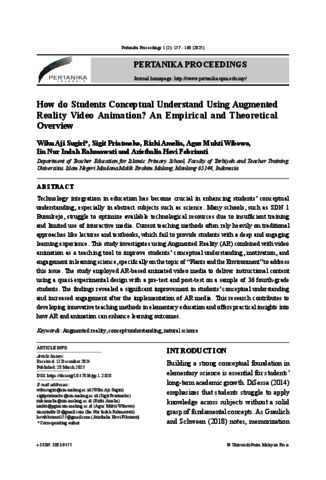 Technology integration in education has become crucial in enhancing students’ conceptual understanding, especially in abstract subjects such as science. Many schools, such as SDN 1 Bunulrejo, struggle to optimize available technological resources due to insufficient training and limited use of interactive media. Current teaching methods often rely heavily on traditional approaches like lectures and textbooks, which fail to provide students with a deep and engaging learning experience. This study investigates using Augmented Reality (AR) combined with video animation as a teaching tool to improve students’ conceptual understanding, motivation, and engagement in learning science, specifically on the topic of “Plants and the Environment” to address this issue. The study employed AR-based animated video media to deliver instructional content using a quasi-experimental design with a pre-test and post-test on a sample of 36 fourth-grade students. The findings revealed a significant improvement in students’ conceptual understanding and increased engagement after the implementation of AR media. This research contributes to developing innovative teaching methods in elementary education and offers practical insights into how AR and animation can enhance learning outcomes.