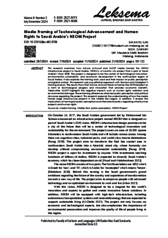 This research examines how Asharq al-Awsat and ALQST media framed the NEOM infrastructure project in Saudi Arabia. NEOM is a futuristic city project that is part of Saudi Arabia's Vision 2030. The project is designed to be the center of technological innovation, environmental sustainability, and economic development in the northwestern region of Saudi Arabia. It also explores the framing tools used and their impact on public perception and global outlook. This research uses a qualitative approach with Gamson and Modigliani’s framing analysis. The results show that Asharq al-Awsat tends to frames the NEOM project as a form of technological progress and innovation that provides economic benefits. Meanwhile, ALQST highlights the negative impacts such as human rights violations and environmental damage. These framing differences affected public perception and political discourse regarding the project. This research expands the understanding of how the media frames large infrastructure projects in the Middle East region. In addition, it reveals the implications of framing for public perception and international policy regarding infrastructure projects and human rights.