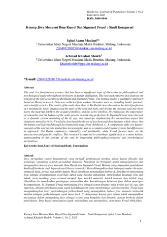 concept of the soul according to Ibn Rushd and Sigmund Freud. The method used is a qualitative approach based on library research. Data was collected from various literature sources, including books, journals, and scientific articles. The results of the study show that: A. Ibn Rushd views the soul as the initial perfection of a mechanistic body, emphasizing the unity of the soul and body, and divides the rational soul into three parts: the material intellect, the acquired intellect, and the active intellect. He emphasizes the importance