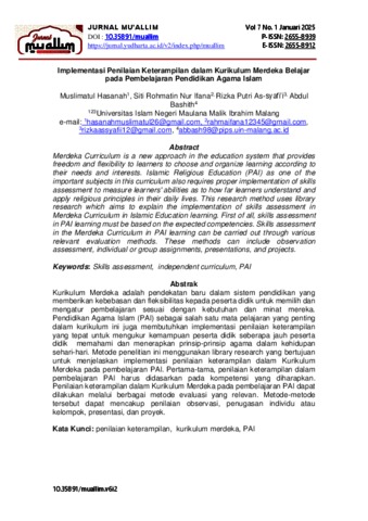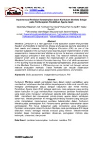 Merdeka Curriculum is a new approach in the education system that provides freedom and flexibility to learners to choose and organize learning according to their needs and interests. Islamic Religious Education (PAI) as one of the important subjects in this curriculum also requires proper implementation of skills assessment to measure learners' abilities as to how far learners understand and apply religious principles in their daily lives. This research method uses library research which aims to explain the implementation of skills assessment in Merdeka Curriculum in Islamic Education learning. First of all, skills assessment in PAI learning must be based on the expected competencies. Skills assessment in the Merdeka Curriculum in PAI learning can be carried out through various relevant evaluation methods. These methods can include observation assessment, individual or group assignments, presentations, and projects.