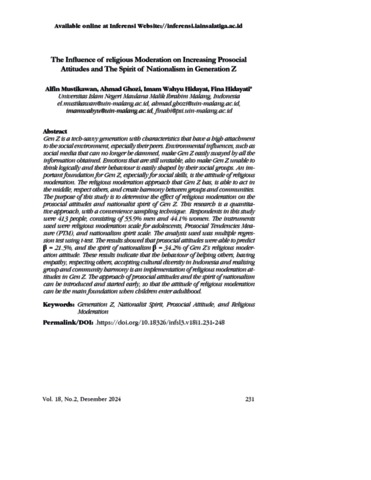 Mustikawan, Alfin, Ghozi, Ahmad, Hidayat, Imam Wahyu and Hidayati, Fina (2024) The influence of religious moderation on increasing prosocial attitudes and the spirit of Nationalism in Generation Z. INFERENSI JURNAL PENELITIAN SOSIAL KEAGAMAAN, 18 (2). pp. 231-248. ISSN 2502-1427