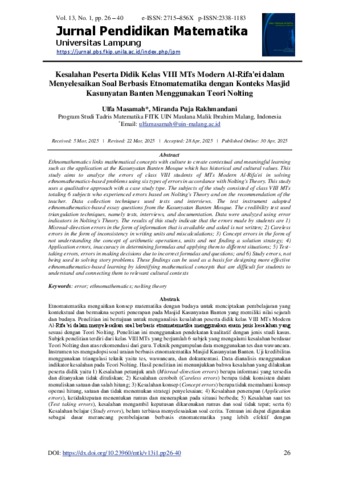 Kesalahan peserta didik kelas VIII MTs Modern Al-Rifa’ei dalam menyelesaikan soal berbasis etnomatematika dengan konteks Masjid Kasunyatan Banten menggunakan Teori Nolting.