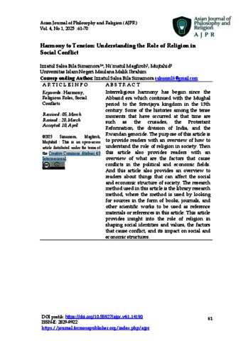 Simamora, Izzatul Salsa Bila, Magfiroh, Ni’matul and Mujtahid, Mujtahid (2025) Harmony to tension: Understanding the role of religion in social conflict. Asian Journal of Philosophy and Religion (AJPR), 4 (1). pp. 61-70. ISSN 2829-9922