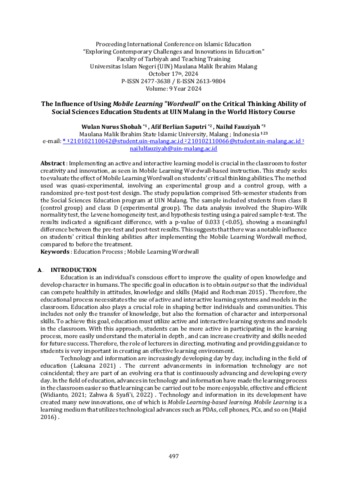 The influence of using mobile learning "Wordwall" on the critical thinking ability of social sciences education students at UIN Malang in the world history course.