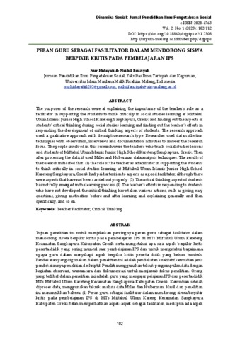 The purposes of the research were at explaining the importance of the teacher's role as a facilitator in supporting the students to think critically in social studies learning at Miftahul Ulum Islamic Junior High School Kareteng Sangkapura, Gresik and finding out the aspects of students' critical thinking during social studies learning and finding out the teacher's efforts in responding the development of critical thinking aspects of students. The research approach used a qualitative approach with descriptive research type. Researcher used data collection techniques with observation, interviews and documentation activities to answer the research focus. The people involved in this research were the teachers who teach social studies lessons and students of Miftahul Ulum Islamic Junior High School Kareteng Sangkapura, Gresik. Then after processing the data, it used Miles and Huberman data analysis techniques. The results of the research indicated that: (1) the role of the teacher as a facilitator in supporting the students to think critically in social studies learning at Miftahul Ulum Islamic Junior High School Kareteng Sangkapura, Gresik had paid attention to aspects as a good facilitator, although there were aspects that have not been carried out properly. (2) The critical thinking aspect of students has not fully emerged in the learning process. (3) The teacher's efforts in responding to students who have not developed the critical thinking have taken various actions, such as giving easy questions, giving motivation before and after learning and explaining generally and then specifically, and so on.