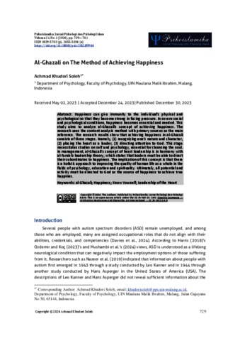 Happiness can give immunity to the individual’s physical and psychological so that they become strong in facing pressure. In severe social and psychological conditions, happiness becomes essential and needed. This study aims to analyze al-Ghazali's concept of achieving happiness. The research uses the content analysis method with primary sources as the main reference. The research results show that achieving happiness in al-Ghazali consists of three stages. Namely, (1) recognizing one’s nature and character, (2) placing the heart as a leader, (3) directing attention to God. This stage necessitates studies on self and psychology, essential for cleansing the soul. In management, al-Ghazali's concept of heart leadership is in harmony with al-Farabi's leadership theory, which states that leaders must be able to direct their subordinates to happiness. The implication of this concept is that there is a holistic approach to improving the quality of human life as a whole in the fields of psychology, education and spirituality. Ultimately, all potential and activity must be directed to God as the source of happiness to achieve true happines.