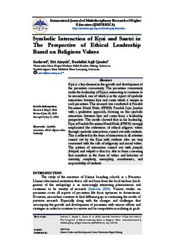 Kyai is a key element in the growth and development of the pesantren community. The pesantren community under the leadership of Kyai is interesting to continue to be researched, one of which is in the aspect of symbolic interaction between kyai and santri which is unique in each pesantren. This research was conducted at Pondok Pesantren Nurul Huda (PPNH) Pondok Joyo Jember with a qualitative approach, focusing on the symbolic interaction between kyai and santri from a leadership perspective. The results showed that in his leadership, Kyai at Pondok Pesantren Nurul Huda (PPNH) strongly emphasized the cultivation of ethical religious values through symbolic interactions carried out with students. This is reflected in the form of interaction in all activities carried out by the Kyai with students who are very concerned with the side of religiosity and moral values. The pattern of interaction carried out with jismiyah, firkriyah, and ruhiyah so that it is able to form a meaning that manifests in the form of values and behavior of sincerity, simplicity, exemplary, assertiveness, and responsibility of students.