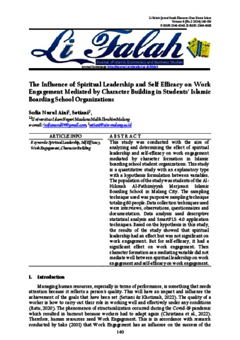 | Keywords: | Spiritual Leadership; Self Efficacy; Work Engagement; Character Building |