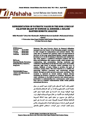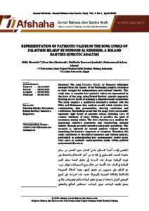 The song Falasthin Biladiy by Humood AlKhudher emerged from the context of the Palestinian people's resistance in their struggle for independence and national identity. This study aims to examine how patriotic values are represented in the lyrics of the song, using Roland Barthes’ semiotic approach, focusing on two levels of meaning is denotation and connotation. The study employs a qualitative descriptive method with the Miles and Huberman data analysis model, which includes data condensation, data presentation, drawing conclusion and verification. The findings reveal that the song’s lyrics successfully represent eight forms of patriotic values, including Love of country, Solidarity of unity, Willing to sacrifice, the spirit of resistance, among others. The lyrics function as a medium for expressing collective awareness and constructing national identity through powerful narrative and poetic symbolism. This research is centered on textual analysis without directly examining the listeners’ responses or reception. Therefore, this study contributes to the field of semiotics and cultural analysis, particularly in understanding how contemporary Arabic music texts serve as symbolic communication media within political and national discourse.